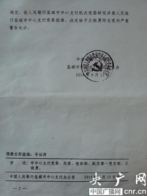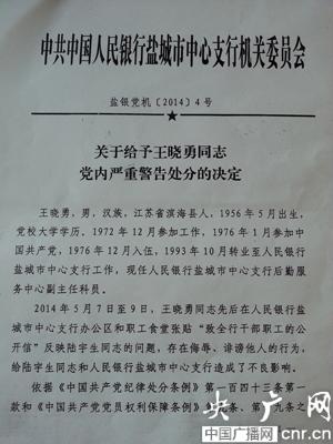 据中国人民银行盐城中心支行机关党委“盐银党机【2014】4号”文件,王晓勇因在盐城中支办公区和食堂张贴“致全行干部职工的公开信”反映陆宇生的问题,存在侮辱、诽谤他人行为,给予党内严重警告处分。随后,王晓勇向盐城市中心支行提起申诉,11月10日,盐城中心支行纪委维持了原处理决定。