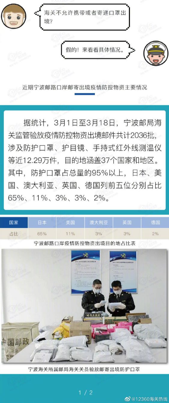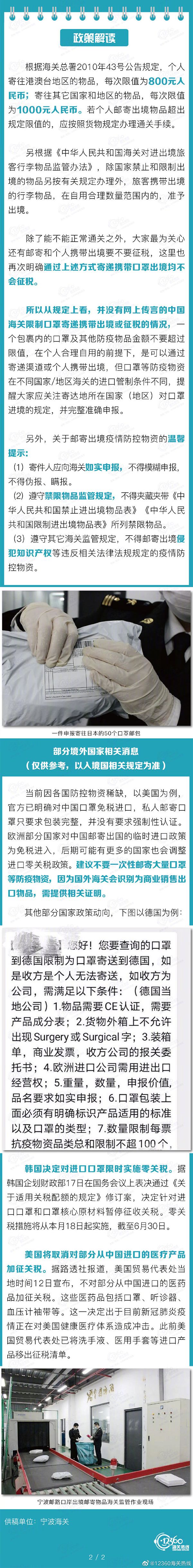 近期,全球许多国家地区新冠肺炎疫情呈现不断蔓延暴发态势,国内很多朋友关心海外华人华侨安危,纷纷询问目前中国海关对于口罩等防疫物资通过寄递渠道或个人携带出境的规定,网上也出现了不少针对中国海关会查扣出境口罩包裹的谣言。详见长图: