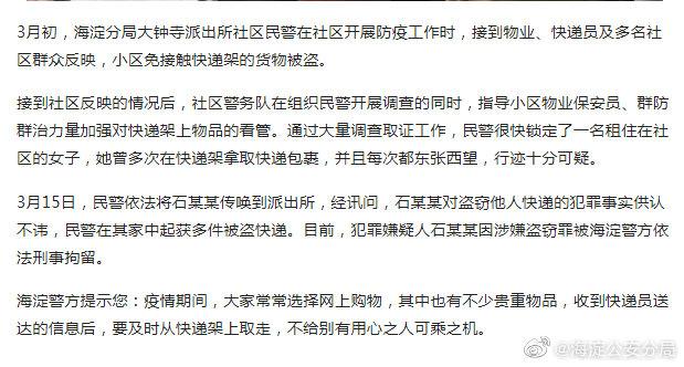3月25日电 据北京市公安局海淀分局官方微博消息,近日,海淀警方抓获一名在小区免接触快递架上盗窃快递的嫌疑人。