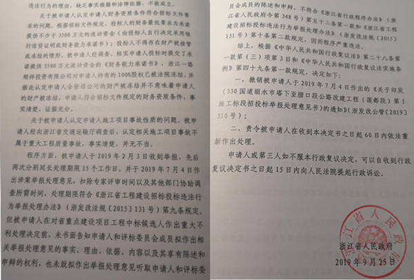 核心提示:“330国道丽水市塔下至腊口段”改建工程,系2018年度浙江省重点工程。浙江一路建设有限公司被作为“中标候选人”公示后,竞争对手要求“补偿”不成竟恶意举报;异乎寻常的是,尽管该举报丝毫经不起调查,尽管这一恶意举报的幕后操控人随即因涉黑涉恶而被当地公安部门立案查处并刑事拘留,但是,省招投标中心和省发改委却对该举报异常“重视”,两次延长调查期限,并通过对招标文件予以越权解释,最终将该中标候选人资格予以否决;之后,尽管浙江省政府复议决定、杭州中院行政判决均要求纠正,但是,省发改委仍拖着不作重新处理,反而向该中标候选人传话称“这个标不可能让你中”。至今,这一惠民重点工程开工仍遥遥无期。