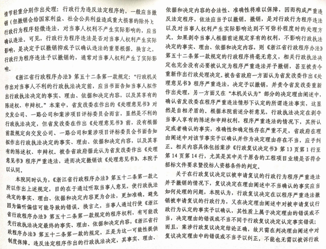 令人欣慰的是,“法治浙江”建设早已历时多年而且深入人心,浙江依法行政的法治水平早已走在全国前列。在此大趋势下,“330国道丽水市塔下至腊口段”公路改建工程中标候选人一路公司此次的遭遇,的确只是个别现象。最终,浙江省发改委《举报处理意见》被浙江省政府(2019) 343号行政复议决定予以撤销,并得到杭州中院的行政判决((2019)浙01行初641号)认可,同时,该《举报处理意见》中所作出的“应认定为无效业绩”的认定,在杭州中院的行政判决中也已被予以纠正和否定。