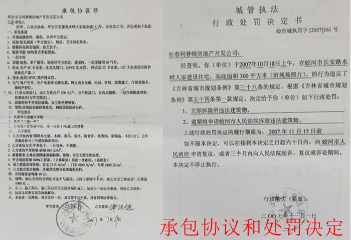 然而,2007年10月18日上午,蛟河市城市管理局的工作人员来到施工现场,向开发商利普顿公司下达了蛟河市城执罚字(2007)161号行政处罚决定书,并责令五号楼立即停止施工,此时一号楼、二号楼 、三号楼 、四号楼都在正常施工,不知为什么唯独五号楼让停止施工。而这时,五号楼已施工完成工程量300平米,基础已经建到一层,柱子完工、东侧部分墙体完工,另有300平米基础已完成,整栋楼窗口过口梁,支模用模板已全部做完,五号楼主体施工量已经完成近半。可是不知为什么,其他同时在建的一号楼、二号楼、三号楼、四号楼都是同一个小区,同一个项目,同一个开发商,他们建的五号楼却成了违建而被停工?当他向利普顿公司法人冯汉青询问有关情况时,得到他这样的答复:“水畔人家小区”五号楼的规划申批手续正在办理中,很快就可以办下来,你们施工队先不要撤离,就在工地停工待命,做好随时复工的准备工作,等我的消息。冯汉青还承诺,停工期间一切损失由他负责,并称这个项目是建设局领导答应过的!公司已经给建设局某领导送过礼,你们就放心等着吧。