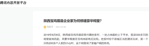 2019年6月8日,陕西省宝鸡市眉县常兴镇杜家村,一处占地面积上千平米、耗资300多万的祠堂拔地而起,其豪华程度在宝鸡地区绝无仅有。杜家村位于县城正北的渭河北岸,是一个只有200多户人家的小山村,这个祠堂成了家喻户晓的传奇。