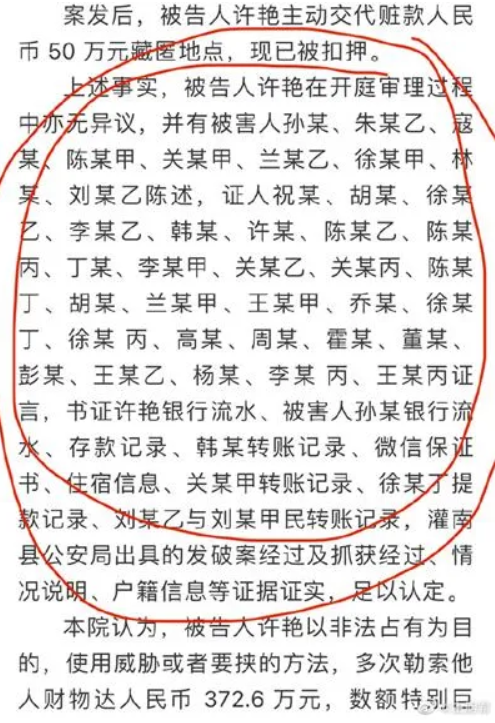 江苏连云港市公安局海州分局辅警许艳,与包括灌云县公安局副局长在内的多名公 职人员发生关系后,多次勒索他人财物达人民币 372.6 万元,一审获刑13年并被处罚金500万元。