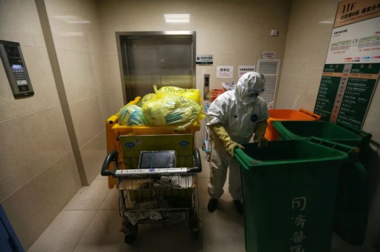 早上六点,武汉同济医院中法新城院区的工作人员开始上岗,清理住院楼内的医疗废物。