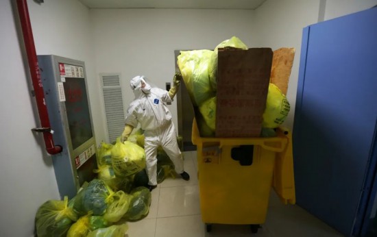 同济中法新城医院的医疗废弃物原本放在医院地下室的暂存间,使用红外线和药水进行消毒,但是随着新冠肺炎疫情的到来,产生的医疗废弃物是以前的近十倍,而且都是感染性的医疗废弃物。“以前我们的医疗废弃物放在垃圾桶里都会把垃圾桶盖子盖上,但是现在医疗废弃物实在太多了,不仅盖子盖不上,我们还要把垃圾硬塞进垃圾箱,有时候装有医疗废弃物的垃圾袋受挤压会突然炸开,严重威胁我们医疗废物处理人员的安全,但是为了尽快收完垃圾,确保院区所有人的安全,我们只能不惜一切代价了。”另一位负责医疗废弃物的处理工作的周师傅称。
