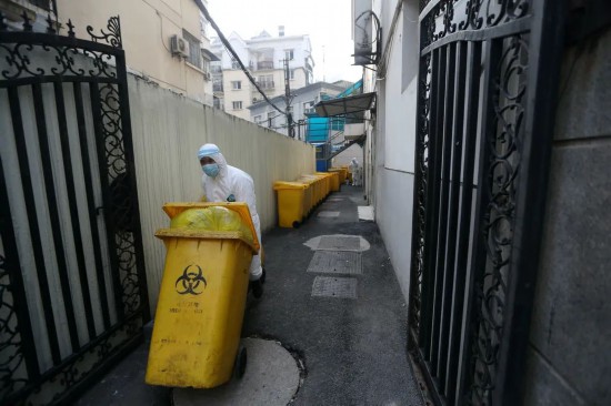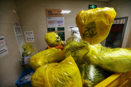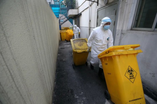 但是医疗废弃物产生的速度实在太快,一线医务工作者用完的防护服、口罩、鞋套……病人的生活垃圾,病人的餐余垃圾,病人的呕吐物等等感染性废弃物都要快速处理,医疗废弃物产生的速度已超过了后勤部门正常的处理速度。周师傅介绍称,ICU中的保洁员会将感染性医疗废弃物集中放在指定处理间的黄色垃圾桶中,然后他们有四位师傅每天早上六点到下午五点会在整个院区不停地转运黄色垃圾桶,然后还会安排专人值班,晚上只要接到院内科室电话就会赶过去把黄色垃圾桶运出来,他们已经保证24小时随时有人在岗负责处理医疗废弃物了,“我们不拼命不行啊,这是人命关天的事。”周师傅称。