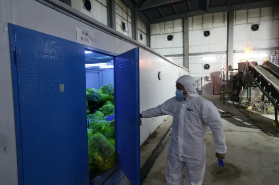 雷神山医院医用垃圾裂解焚烧车间的暂存仓库里,配有24小时紫外线照射消毒。