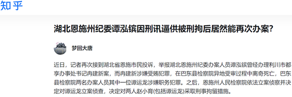 但不知什么原因,谭运龙摇身一变改名谭泓镔被恩施州纪委重用再次办理刘某、谢某、谭某多起案件。记者了解到,被谭泓镔办理过的案件都逃不过刑询逼供恶梦。根据投诉人提供的线索,记者对此进行了深度挖掘探访。