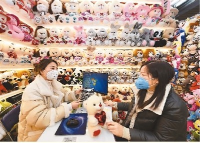 2月18日,在义乌国际商贸城中,市场经营户正在与客户交易洽谈。 |