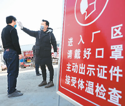 2月20日,在浙江杭州市一家纺织印染厂门口,工作人员为进入厂区的工人测量体温。 |