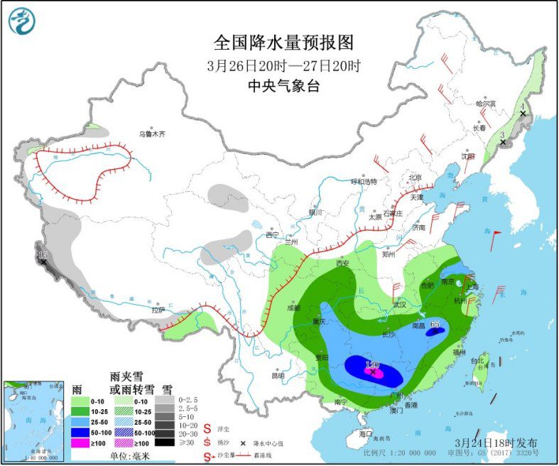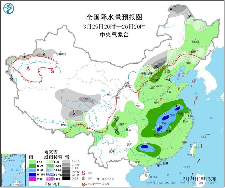 3月25日20时至26日20时,东北地区北部和南部、内蒙古中部、河北北部、新疆沿天山地区、青海南部、西藏东部等地的部分地区有小到中雪或雨夹雪,河北北部局地有大雪(5~8毫米);黄淮南部、江淮、江南北部、华南北部等地的部分地区有中到大雨,其中,安徽东部、湖北东部、湖南东北部、广西北部等地局地有暴雨(50~70毫米)。西北地区东部、内蒙古中东部、华北、东北地区中南部等地的部分地区有5~6级风。新疆南疆盆地等地的部分地区有扬沙或浮尘。渤海、渤海海峡有7~8级风,阵风9~10级;黄海大部、东海北部有6~7级风,阵风8级(见图3)。