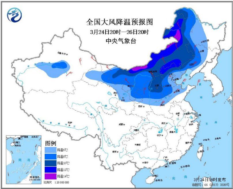 24日20时至26日20时,新疆东部和南疆盆地、西北地区东部、华北、东北地区大部、黄淮等地先后有4~6级风,阵风7~9级,上述大部地区日平均气温或最低气温下降6~10℃,华北北部局地降温可达12℃以上(见图1);南疆盆地、内蒙古西部、甘肃中西部偏北地区、宁夏等地有扬沙或浮尘,局地有沙尘暴。中央气象台3月24日18时发布寒潮蓝色预警。