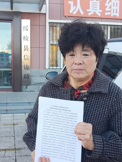 本站讯 黑龙江省绥棱县,呼兰河右岸,阁山水库是那样的雄浑、辽阔!今年已经60岁的纪正华就在这个大型水库岸边——长山乡幸福村辛勤的劳作着,从2004年开始,她和弟媳李娟开始经营林地,但是,从2015年起,修建阁山水库占了她的林地后,她就为了得到补偿开始走上了上访告状之路,然而,上访的路她走的异常艰辛、曲折。