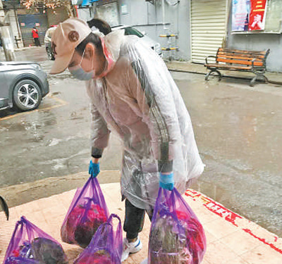 跟着社区工作者送“爱心菜”到各个楼栋,是王诗雨的两大任务之一,另一项是每天打电话排查居民健康状况。王诗雨说,她每天要打上百个电话,“有些爷爷奶奶心里害怕,接到电话会问东问西,我就要安慰他们。”