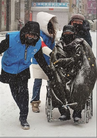 2月15日,辽宁省沈阳市苏家屯区防疫青年突击队的两名青年志愿者在解放街道广场社区为行动不便的老人推轮椅。 |
