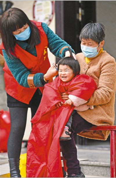 3月4日,浙江省湖州市长兴县排田漾村,志愿者在为2岁的马星宇免费理发。马星宇的父亲已在防疫卡点一线坚守40天。长兴县组织志愿者为疫情防控人员家庭提供爱心陪读、免费理发、义务劳动等。 |