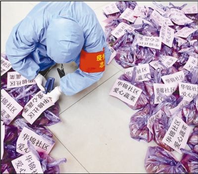 2月23日,武汉市武昌区华锦社区的志愿者为社区居民分装爱心蔬菜。 |