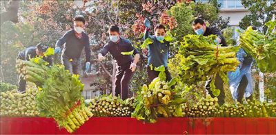 2月19日,四川省多家单位捐赠的107吨莴苣、萝卜、水果等物资抵达武汉江汉区。图为党员志愿者在快速卸载货物。 |