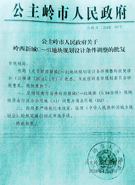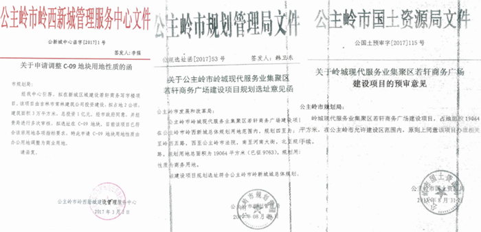 早在2017年8月31日,公主岭市国土资源局(现更名公主岭市自然资源局)文件,即:“公国土预审(2017)115号文”中载明,“关于岭城现代化服务集聚区若轩商务广场建设项目,占地面积19064平方米,在公主岭市允许建设区范围内,原则上同意该项目办理相关手续。”这份“公国土预审(2017)115号文”是印发给公主岭市规划局的预审文件。那么,2019年12月27日,公主岭市自然资源局将最初文件中“原则上”掀翻在地,文件上白纸黑字,而且加盖了朱红印章,公主岭市自然资源局为何对三早项目宣判“死刑”呢?