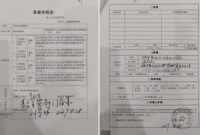 2017年8月28日,长春市宽城区发改局向吉林省工商行政管理局(现吉林省市场监督管理厅)提交主管单位变更申请,据《备案审核表》显示,备案信息显示长春市发改局备案为主管单位及出资人,却没有提供出资证明。企业法人(法人类型11)使用备案一词“变更”为机关法人(法人类型14)。