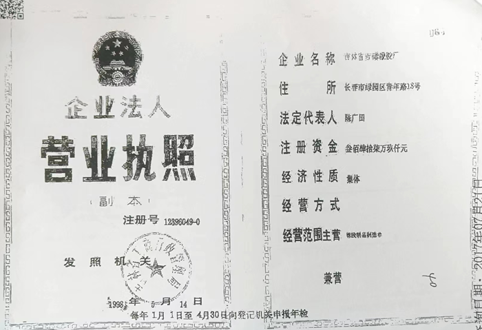1993年10月15日,长春市橡胶制品二厂向吉林省工商行政管理局申请变更登记,企业申请变更登记注册书显示,主管部门变更为吉林省储备物资管理局并更名吉林省吉储橡胶厂。