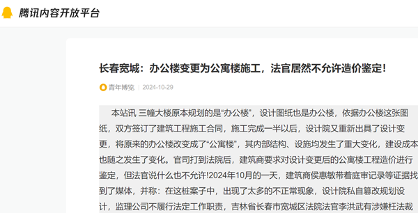 本站讯 三幢大楼原本规划的是“办公楼”,设计图纸也是办公楼,依据办公楼这张图纸,双方签订了建筑工程施工合同,施工完成一半以后,设计院又重新出具了设计变更,将原来的办公楼改变成了“公寓楼”,其内部结构、设施均发生了重大变化,建设成本也随之发生了变化。官司打到法院后,建筑商要求对设计变更后的公寓楼工程造价进行鉴定,但法官说什么也不允许!2024年10月的一天,建筑商侯惠敏带着庭审记录等证据找到了媒体,并称:在这桩案子中,出现了太多的不正常现象,设计院私自篡改规划设计,监理公司不履行法定工作职责,吉林省长春市宽城区法院法官李洪武有涉嫌枉法裁判的嫌疑。