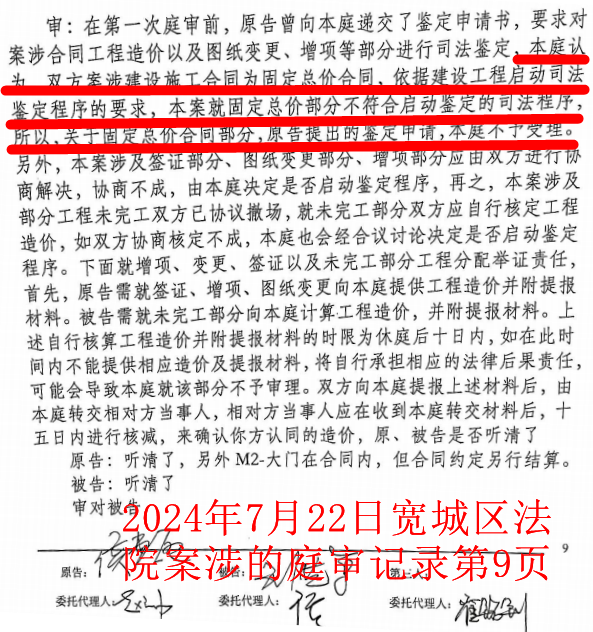 侯惠敏还激动的说:请问李洪武法官,该合同已经被判处无效,固定总价怎么能有效呢?因为固定总价是依据设计的办公楼图纸签订的建筑工程施工合同,那么本图纸都不在了,也没有使用,那固定总价怎么能有效呢?实际施工的是设计变更后的公寓楼图纸,两者之间相差工程造价千万元。为什么不允许我们申请重新做司法鉴定?李洪武法官,你这样做,不是明显在袒护被告一方吗?在此案中,设计图纸变更了,也没有盖审批章,监理公司在没有设计变更审批盖章的情况下就让我们按照新图纸施工,这一切都是严重的违法违规行为。对于这些问题,我将向吉林省住建厅进行实名举报。如果法官李洪武不保护我的司法鉴定权利,就涉嫌枉法裁判。我不管开发商崔波、法官李洪武有什么样的背景,有什么样的后台,有什么样的保护伞,我都将去中央纪委、国家监委、最高人民法院去控告,以维护我的合法权益。