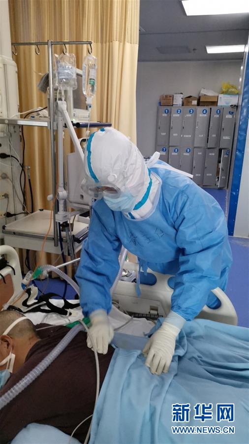 戴春在武汉市新洲区人民医院重症监护室为一名患者拍背。(资料照片) 新华社发