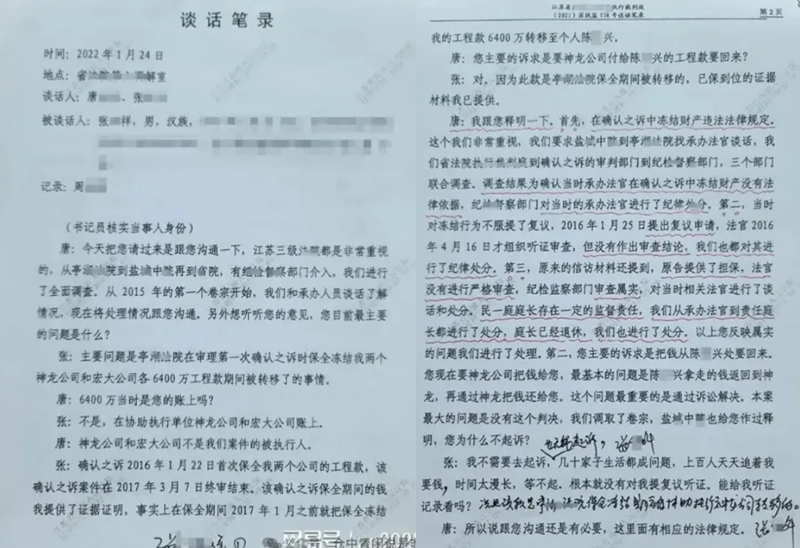 2022年1月24日,江苏省高级法院在(2021)苏执监538号案件谈话中,给出了权威认定:亭湖法院对张继祥工程款的冻结行为,存在三项违法违规:一是在无给付内容的确认之诉中违法采取保全措施;二是对当事人复议申请不予审查,剥夺了其法定救济权利;三是对保全担保人资格审查严重不严,直接导致财产转移。同时,省高院告知张继祥,已对五名涉事法官作出处分,并承诺协调解决其实际问题。
