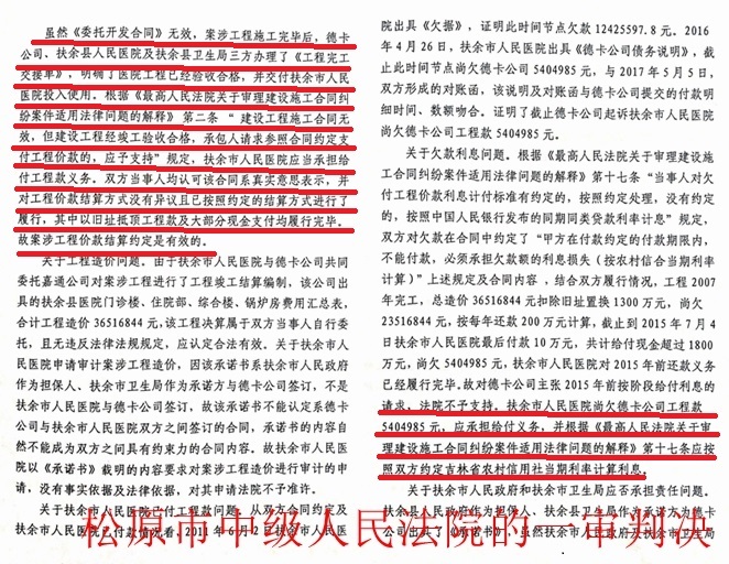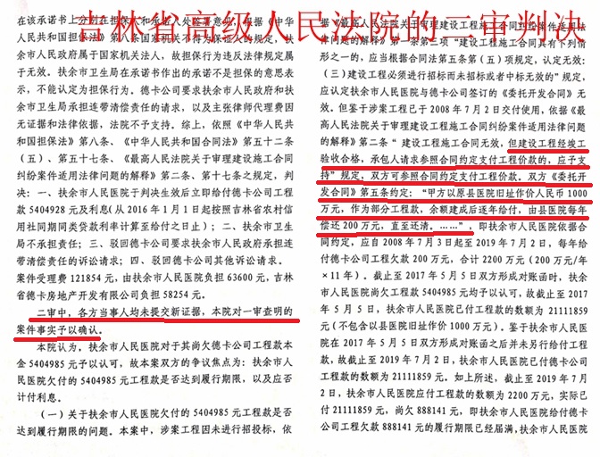 令德卡公司百思不得其解的是,省高院经过开庭审理,查明的事实与一审查明的事实是一致的,却做出了截然不同的判决。省高院(2019)吉民终392号判决书称:“综上所述,一审判决认定事实清楚”,“但适用法律确有不当之处。扶余市人民医院的上诉请求部分成立,应予支持”。高院遂判决:“一、撤销吉林省松原市中级人民法院(2019)吉07民初12号民事判决;二、扶余市人民医院于本判决生效后立即给付吉林省德卡房地产开发有限公司工程款888141元及利息(自2019年7月3日至实际给付之日止,按照中国人民银行同期同类贷款利率计算)……”