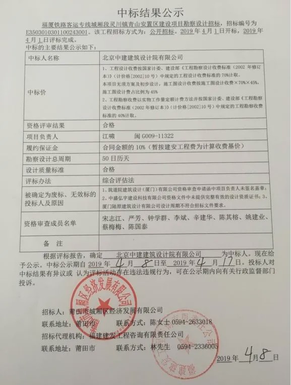 例如,2019年4月1日开标的福厦铁路客运专线城厢段灵川镇青山安置区建设项目勘察设计招标,其勘察设计周期为50日,投标保证金为合同价款的10%,北京中建建筑设计院有限公司则中标有效。(下图)