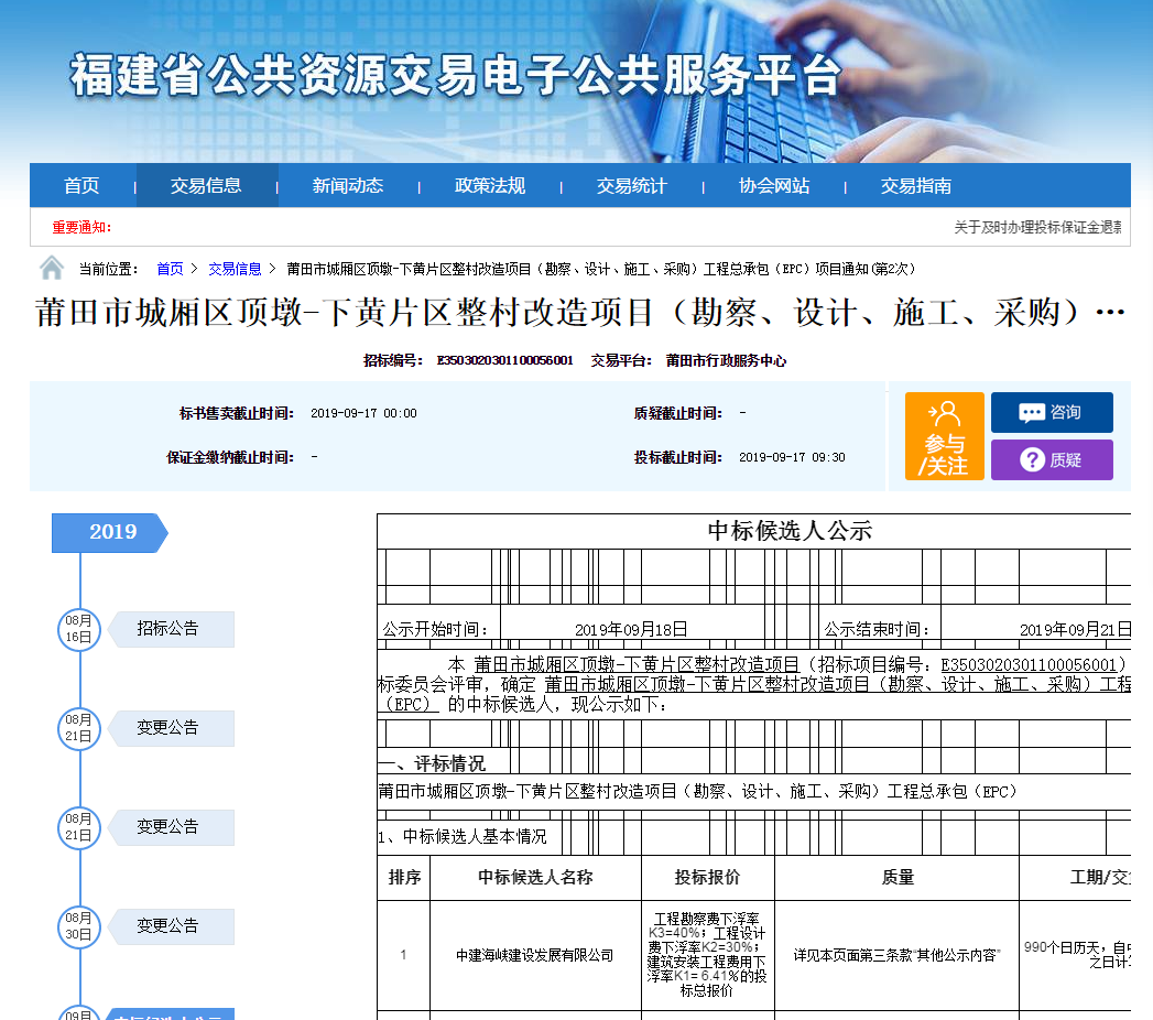 据了解,厦门市住宅设计院被无故废标后,招标人并没有再次进行招标,而是由城厢区某领导打招呼,为中建海峡建设发展有限公司设置量身订做条件,将该项目直接打包成EPC,于2019年9月17日让中建海峡中标。