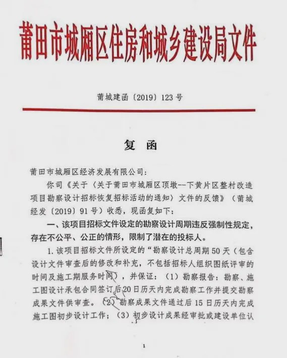 后来后得知,招标人未发出中标通知书的原因是:莆田市城厢区住房和城乡建设局干预该项目招投标,并于2019年6月27日向招标人发出“莆城建函〔 2019 〕 123 号”《复函》。