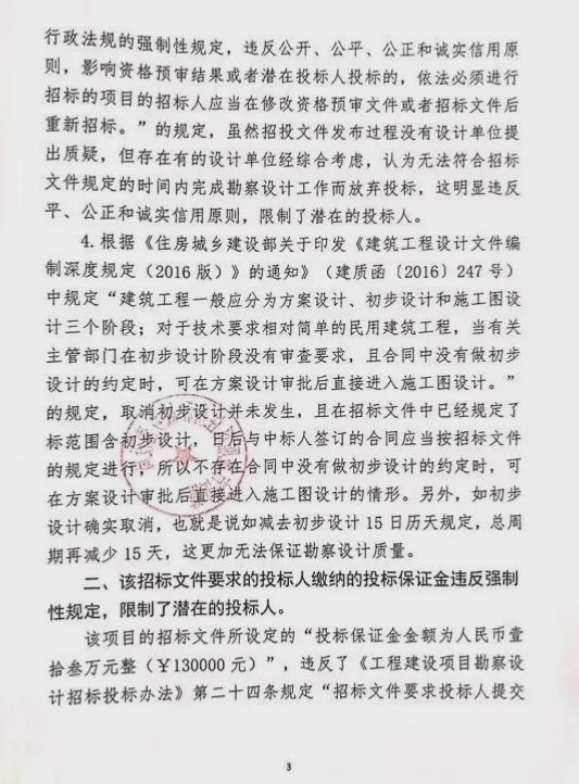 也就是说,该项目招标文件所设定的“勘察设计总周期50天”的条件,违反了《福建省房屋建筑和市政基础设施工程勘察设计招标投标管理若干规定》(闽建(2018)3号)文件第十九条中规定:招标人应给予中标人合理的勘察设计周期,以保证工程的勘察设计质量。①甲级工程勘察项目的详细勘察时间不少于30天;②大型工程的初步设计时间不少于30天;③大型工程的施工图设计时间不少于50天;(2)《住房城乡建设部关于印发全国建筑设计周期定额(2016版)的通知》(建质函(2016)295号)中“建设单位和设计单位不得任意压缩设计周期”,所以该招文件中的条款任意压缩设计周期,明显违规。