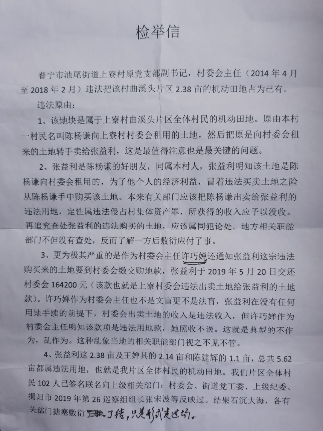 2019年4月—6月,揭阳市第二十六巡视组对普宁池尾街道进行巡视。在巡视期间,上寮村102名村民联名向巡视组举报反映张益利存在的问题,其中包括他霸占曲溪头片区2.38亩集体土地的事实。