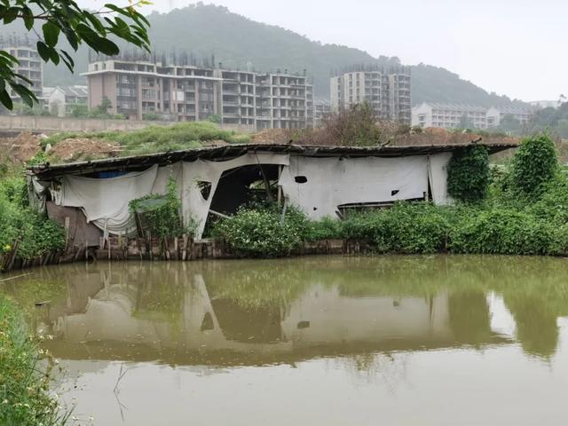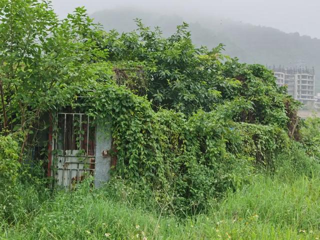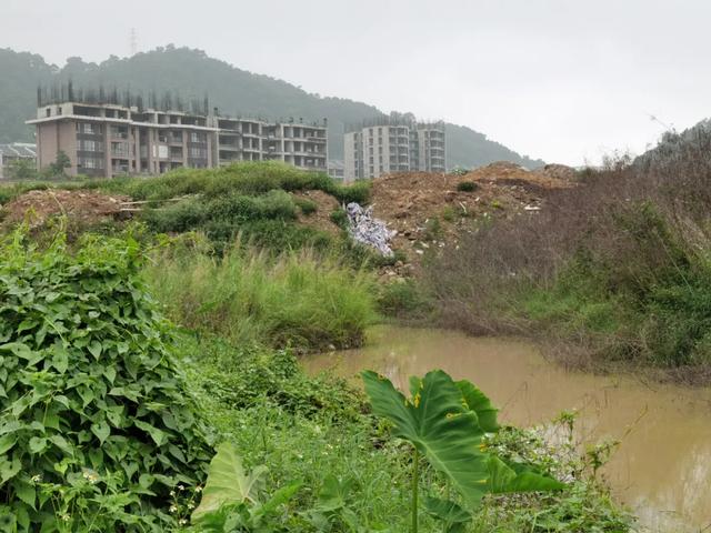▲被填埋的鱼池已杂草丛生,背后那开发商的楼也烂尾了。
