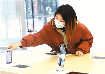 今年一季度,国产品牌华为推出5G旗舰手机P40系列,吸引了不少市民前来体验。图为顾客在位于杭州的华为旗舰店内体验P40系列手机。 |