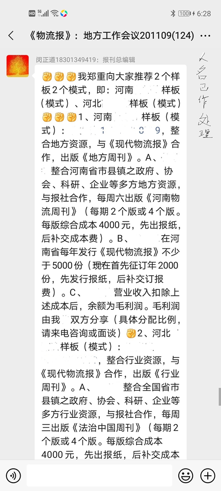 今年3月3日,河北省《现代物流报》社长和新近走马上任的副社长闵某从河南省漯河考察归来,新副社长在报社多个微信公众群里对报社采编人员和经营人员发出指示:“每年发行《现代物流报》不少于5000份(每份年定价:199元),现在首先征订2000份,先发行报纸,后补交订报,每个周刊版面费4000元,先出报纸,后补成本……”