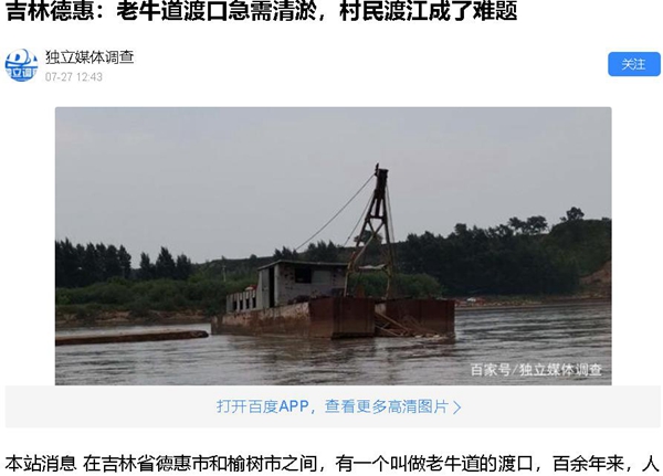 今年夏天,记者接到德惠市岔路口镇朝阳山村民刘凤奎、朝阳山村书记程恩山、解放屯社社长王庆余、李坨子社社长张遇书、腰窝卜社社长周凤恩的《情况反映》,反映德惠市“老牛道”渡口由于多年没有清淤,现在渡口已经停运、村民们出行十分不便的情况。