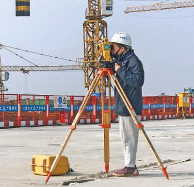 郑州南站施工现场,测量员正在用全站仪进行施工点位测量。记者 毕京津摄