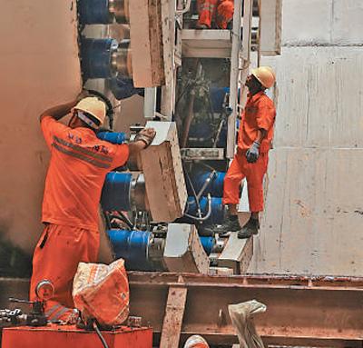 沈阳地铁四号线施工现场,盾构主机正在下井组装。记者 刘洪超摄