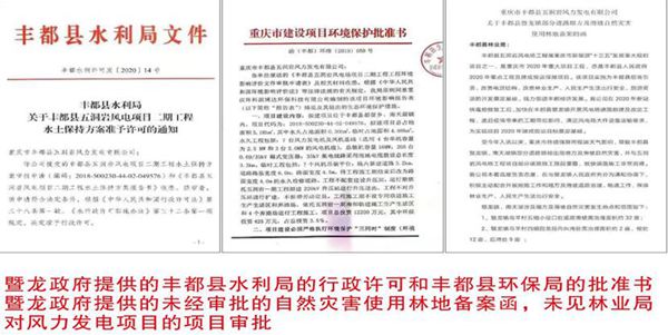 相隔两天后,暨龙镇人民政府向记者提供资料显示,丰都县水利局许可发[2020]14号关于丰都县五洞岩风电项目二期工程水土保持方案准予许可通知,以及重庆市建设项目环境保护批准书渝(丰都)环准(2019)058号,另外提供了关于丰都县塈龙镇部分道路塌方及滑坡自然灾害使用林地备案函件,对所涉及了解的问题未作明确答复,涉及核实了解的相关问题相互推诿,依据丰都县塈龙镇部分道路塌方及滑坡自然灾害使用林地备案函件,记者用短信方式核实了解林业局毛局长如下问题:1、请问毛局长,这个函件该局是否收到?是否批复行政许可?2、丰都县五洞岩风力发电有限公司毀林面积达到200多亩,你是否去过现场查看监督?记者现场看到,造成人为毁林面积200亩光头山,贵公司是否遵照《中华人民共和国森林法》三十九条规定?如此大面积毀林是否存在监管严重缺失问题?对记者所提出的相关问题,林业局毛局长至今未作明确答复,暨龙镇人民政府、丰都县林业局关于丰都县五洞岩风力发电有限公司人为毁林面积达200余亩光头山造成的山体滑坡和泥石流,暨龙镇政府、丰都县林局是否存在监管严重缺失,相信群众的眼睛是雪亮的。