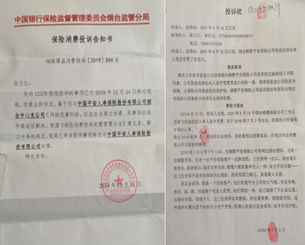 记者在张玉红提供的《中国银行保险监督管理委员会烟台监管分局保险消费投诉处理决定告知书》(烟银保监消费投诉(2019)458号)中看到,保险公司针对张玉红的投诉,答复称“证据不足无法认定”,同时还称:“在办理保单号为“11000005810128”的保险合同变更事项中,未采取合理方式确认代理关系存在,针对该问题我局将依法采取监管措施。”该告知书称: