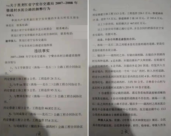 据张军旺回忆,2014年12月23日,他和北石村时任村主任杨玉武、会计曾宪凤,村民李孝金等人,在宁安市交通局档案室调取出07年—08年北石村5份通村公路合同,他们当时就懵了,因为北石村并没有这几条通村公路,五份合同均涉嫌造假。为此,北石村召开全村党员和村民代表大会决定,以刘成涉嫌诈骗为由向宁安市公安局报案,就宁安市交通局涉嫌通村公路合同造假,骗取国家补助等严重违法、违纪问题形成材料,向有关部门实名举报。