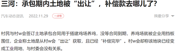 近日,家住河北省三河市泃阳镇北陈庄村民刘艳承包的养鸡场,被当地的企业三河同飞制冷股份有限公司(简称“同飞制冷”)于深夜组织工人用铁皮围挡圈起来准备施工,刘艳找到作为施工方的同飞制冷要求给出解释。接待刘艳的负责人称,刘艳所说的承包地是该企业通过出让的方式获取的,出让金已经交付,过程合理合法,且已经补偿完毕。