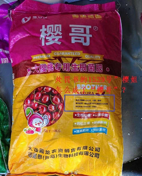 ——瓦房店市农业农村局对2种肥料做出的行政处罚决定书,其中涉及的微生物肥(2015)准字(1529)是“樱哥大樱桃专用生根菌肥”,而不是处罚决定书中所说的“樱桃姐姐生根菌肥”,“樱桃姐姐生根菌肥”的登记证号是微生物肥(2018)准字(5451)。你们连处罚了哪种产品都会写错,如此破绽百出的行政处罚决定书,工作专班都没有发现?这叫“认真核查”“事实清楚”吗?你们就是以这个错误的处罚决定书回复大连市委、市政府和省委、省政府的吗?