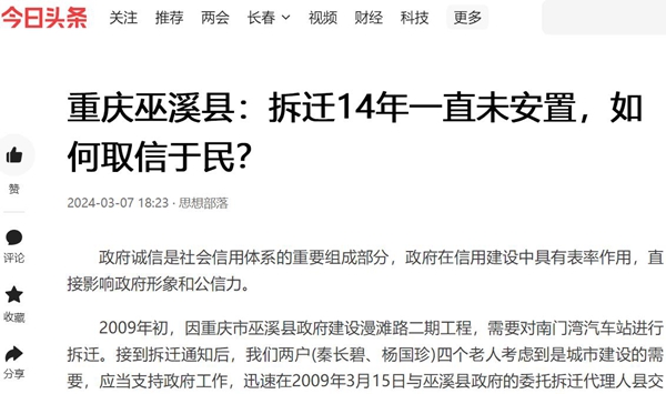 老人家说:今年是2024年,拆迁已经整整14年过去了,我们还是什么都没有等到。期间,我们通过网络向相关部门反映,得到的回复称:“已经处理完结”,这不是欺骗上级、忽悠老百姓吗?政府竟然能够这样不讲诚信吗?
