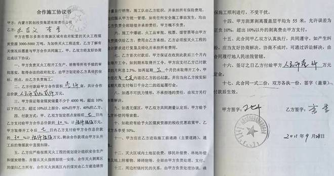 据警方的起诉意见书,王建平还曾经向他人转让海伊奎煤矿灭火工程开采收益权。根据北京市公安局丰台分局查明:2013年4月,北京凯骐国际汽车贸易有限公司(下称凯骐国际)法人代表靳琳经他人介绍后认识王建平,王谎称其所有的海伊奎煤矿合法拥有总面积为2000亩的灭火工程项目采矿权,并且提供了伪造的文号为鄂国土资字[2014]24号、标题为“鄂尔多斯市国土资源局关于海伊奎煤矿和松树焉煤矿火区治理工程临时用地的请示”。双方经过协商后于2013年7月26日签订了《准格尔旗海伊奎煤矿有限责任公司开采收益权转让协议书》,约定王建平的海伊奎煤矿合法拥有2000亩的灭火工程项目采矿权,王建平将该项目40%的开采收益权转让给凯骐国际,开采收益权转让总价为3500万,王建平在收到款项后保证在2013年12月31日前达产出煤。之后,王建平与凯骐国际签订了《准格尔旗海伊奎煤矿有限责任公司开采收益权转让补充协议书》,约定将转让总价减少至3300万元。协议签订后,凯骐国际依照合同约定向王建平指定账户打款3300万元。后凯骐国际发现海伊奎煤矿一直未开采,多次向王建平讨要,王建平退还1700万元,剩余款项迟迟不还。