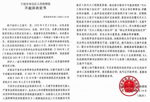 奉化区检察院的不起诉决定书(甬奉检刑不诉[2022]19号)称:“经本院审查并退回补充侦查,本院仍然认为宁波市公安局奉化分局认定的犯罪事实不清、证据不足,被不起诉人王建平在签订、履行合同的过程中是否实施虚构事实、隐瞒真相等欺骗行为以及被害人是否产生错误认识等均存在疑问,不符合起诉条件。依照《中华人民共和国刑事诉讼法》第一百七十五条第四款、《人民检察院刑事诉讼规则》第三百六十七条第二款的规定,决定对王建平不起诉。”